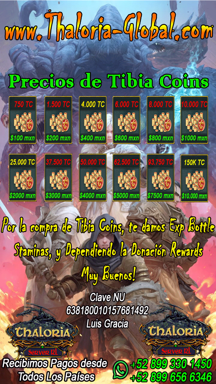 ⚔️ ¡EL RETORNO DE LA LEYENDA: GRAN APERTURA! ⚔️THALORIA-GLOBAL - v13.40 / OTC / Android La puerta a un nuevo mundo se abre. Prepárate para una experiencia inigualable donde la nostalgia se encuentra con la innovación. ¡NO TE LA PIERDAS! CARACTERÍSTICAS LEGENDARIAS DEL SERVER: ✅ AUTOLOOT PERSONALIZADO: Olvídate de la tediosa recolección y enfócate en la acción, checa el comando !autoloot para mas información. ✅ CASTLE WAR: Revive la experiencia clásica y lucha por el honor en batallas masivas. ✅ BATTLEFIELD: Implementamos el evento Battlefield 2 Teams, para que batallen por los siguientes Rewards: (50 TCs - 5 Exp Bottle - 100 Tournament Coins). #Todos los días a las 22:50 PM México City. ✅ EVENTOS DE BOSSES DIARIOS: Enfrenta desafíos épicos con recompensas a la altura de los dioses. ✅ LOOT POUCH & AUTOLOOT DEST: Actualizamos nuestro autoloot para poder escoger dónde lootear con el comando !autoloot dest eliges (Loot Pouch) y empiezas a lootear allí. capacidad máxima de 2.000 Items dentro de ella, la encuentras en nuestro Store in Game! ✅ OLD UTAMO & PVP MEJORADO: Disfruta de un sistema de combate fluido y estratégico con Cooldowns bajos en magias y runas. ¡El arte del PVP ha sido Perfeccionado! ✅ PORTALES DE REGRESO: Viaja rápidamente de vuelta a Thais desde tus zonas de Hunt y Bosses, sólo debes tener encima 10 Tournament Coins (damos 10 cada hora). ✅ RULETAS EXCLUSIVAS: Pon a prueba tu suerte y gana ítems únicos. ✅ RUNA PARA SUBIR TIER: Con esta innovadora runa creada, puedes aumentar máximo hasta Tier 3!, disponible en nuestra Store in Game por 750 TCs cada una!. recordándoles que segun el tier pide runas! Tier 1 = 1 Runa Tier 2 = 2 Runas Tier 3 = 3 Runas ✅TELEPORT SCROLL: ¡Para Facilitarte la vida! tenemos Teleport Scroll también en nuestra Store in Game (sirve para viajar a muchisimos lugares). ✅ VIP Y SU ZONA!: Disfruta de 20% + de Exp, Loot, Skill con nuestra VIP, (al crear tu cuenta te regalamos 3 días de prueba), tenemos Bosses y zona Hunt por level! tiene el 97% de Todos los bosses en ella, incluyendo Ferumbras, Sanguine, Soul, Primal, Eldritch, Falcon, etc. ¡El campo de batalla te espera!